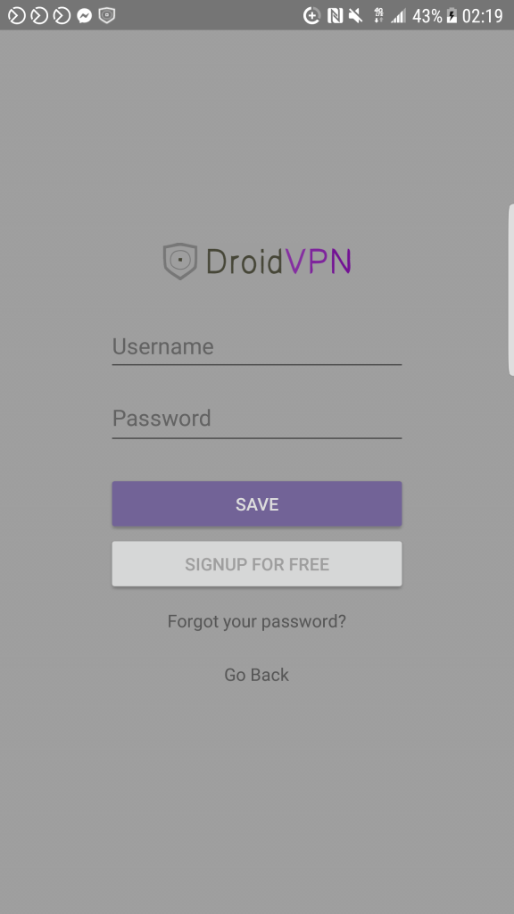 Allez encore dans « account » et remplissez les coordonnées de votre compte droid vpn puis Appuyez sur « save »