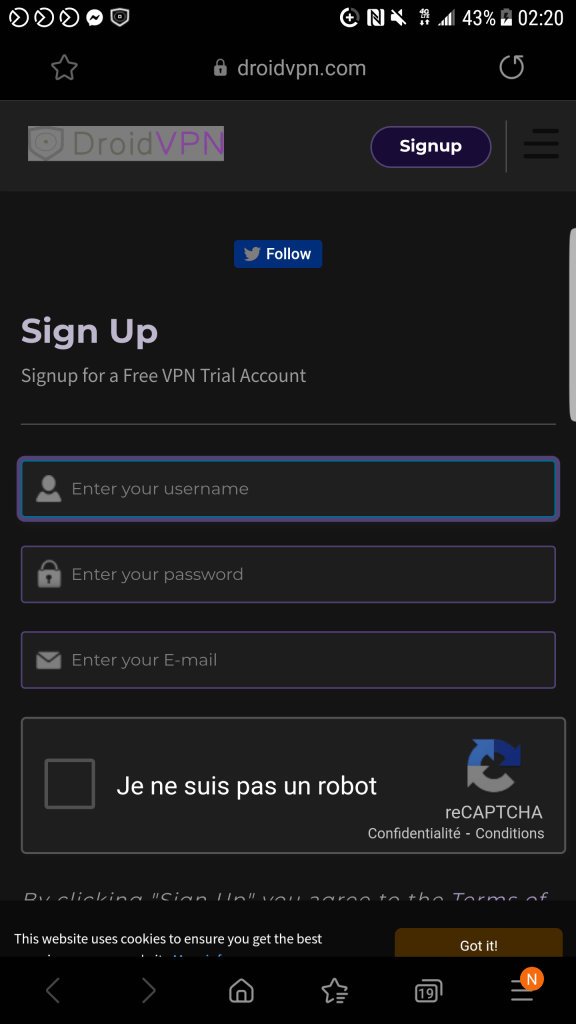 Appuyez sur « sign up for free » et vous serez dirigé vers le site officiel de droid vpn,